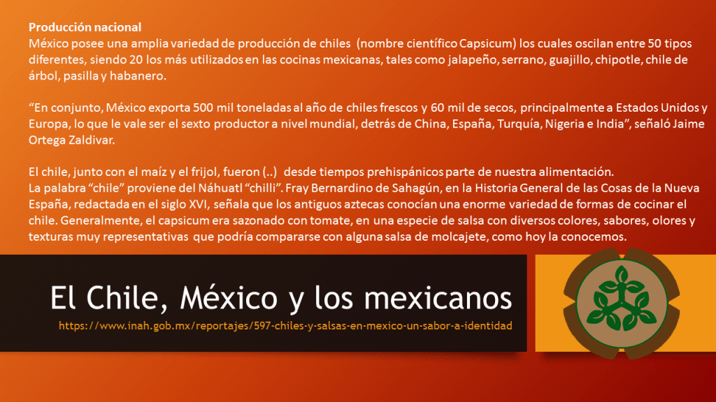 El chile es un ingrediente que no solo aporta sabor a los platillos, sino aporta nutrientes, carácter y también simboliza la identidad cultura mexicana. Desde antes de la época precolombina, el chile ha sido parte integral de la dieta ancestral y ha sido utilizado en diversas formas: desde su uso militar hasta su importancia ritual y monetaria. Su presencia en la cocina y sociedad mexicana es tan fundamental que se estima que el chile está presente en el 90% de los platillos mexicanos, además que es utilizado como símbolo y referencias coloquiales de la cultura popular. Este fruto con su diversidad de tipos y variedades, refleja la riqueza de la biodiversidad y la historia cultural de México.